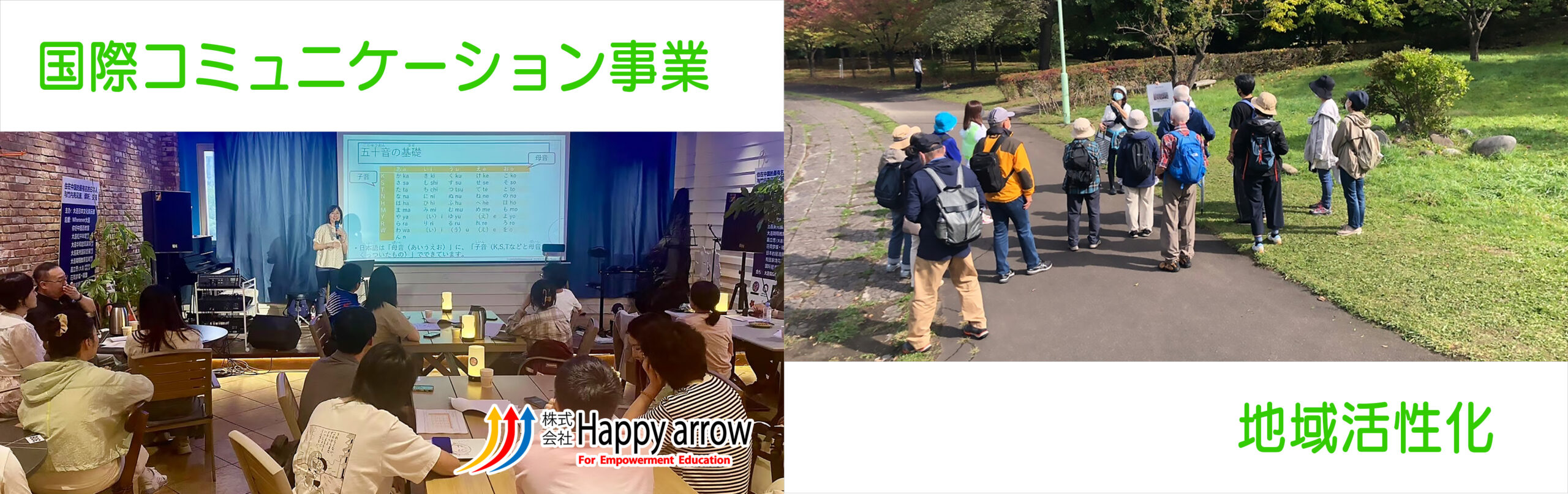 人と組織の成長を支える研修事業、未来を描く力を育むキャリア教育、文化を越えて学び合う国際コミュニケーション事業、地域の魅力を発信する地域活性化――4つのフィールドで、心を通わせる学びと出会いを創造してまいります。